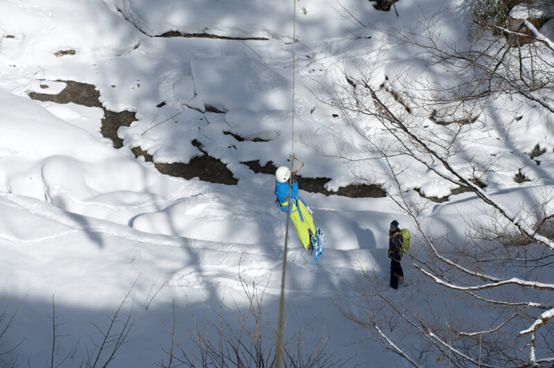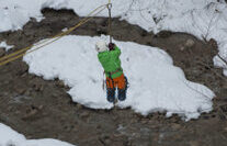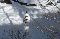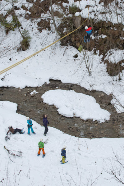In Kombination mit einer naturnahen Schneeschuhwanderung, bieten wir als Adrenalinkick die aufregende Fahrt mit einem mobilen Flying Fox in eine verschneite Schlucht.