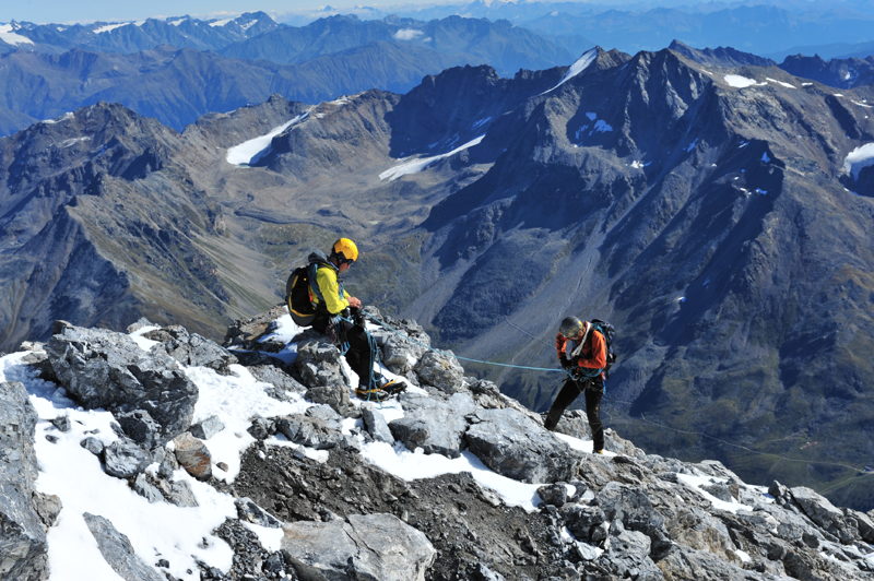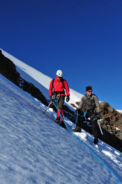 - Praktische Ausbildung Eis: Gehen auf Schneefeldern und Abbremsen von Stürzen, Gehen mit Steigeisen- Frontalzackentechnik, Ecksteintechnik, Stufenschlagen, Knotenkunde, Spuranlage auf dem Gletscher, Anbringen von Fixpunkten und Sichern, Überwinden von kurzen Steilstufen, Abseilen, Spaltenbergung.